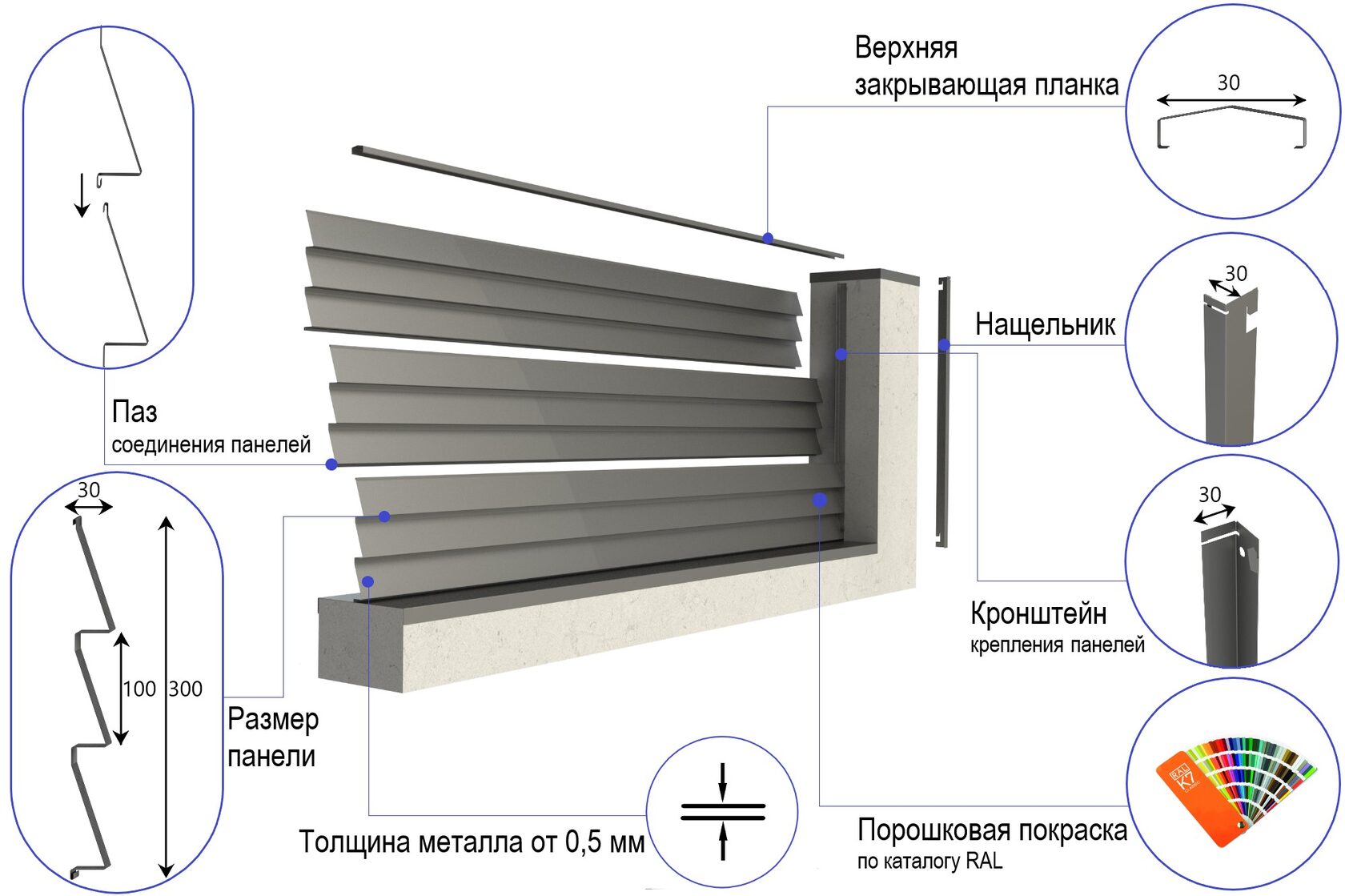 Конструкция выполнена в виде готовых модулей по принципу профилированного листа, что ускоряет монтаж и снижает затраты без потери жёсткости и геометрии. Наклон ламелей обеспечивает защиту от посторонних взглядов, сохраняя естественную циркуляцию воздуха и аккуратный архитектурный ритм фасада.